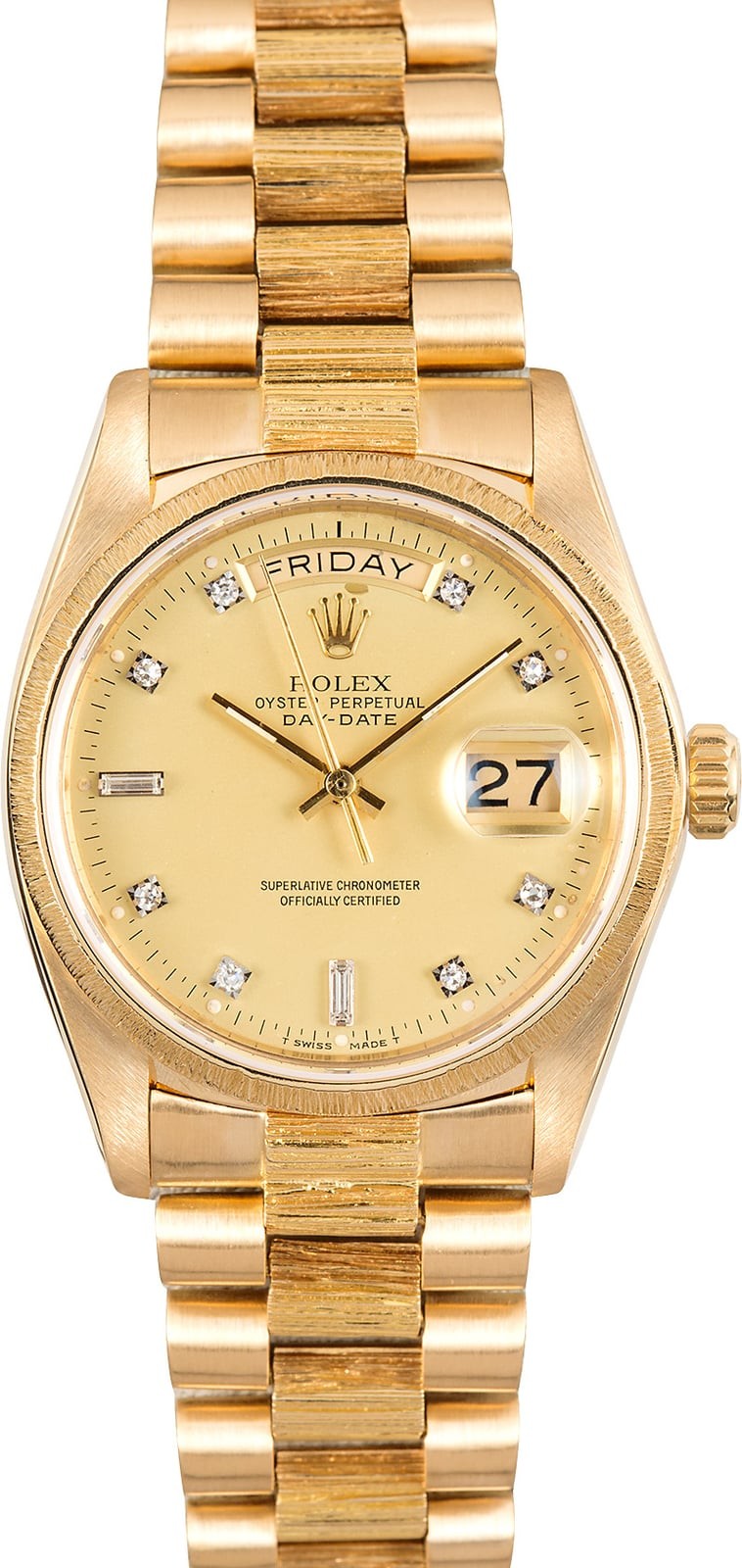 - Dial: Rolex Champagne w/ diamond hour markers (8 rounds, 2 baguettes)