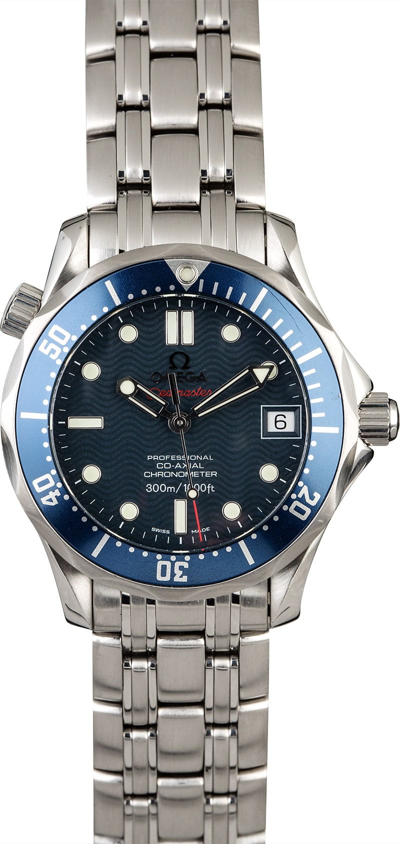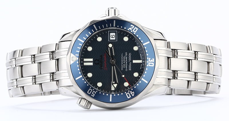 - Features: Omega 2500 self-winding Chronometer movement w/ date, screw-down crown, scratch-resistant domed anti-reflective sapphire crystal, uni-direction rotatable bezel, water-resistant to 1,000ft (300m)