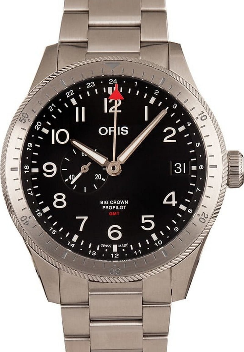 - Dial: Black w/ luminous hands and Arabic hour markers w/ red tipped GMT hand, sub dial at 9 o'clock and date at 3 o'clock
